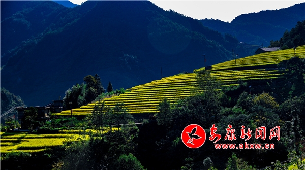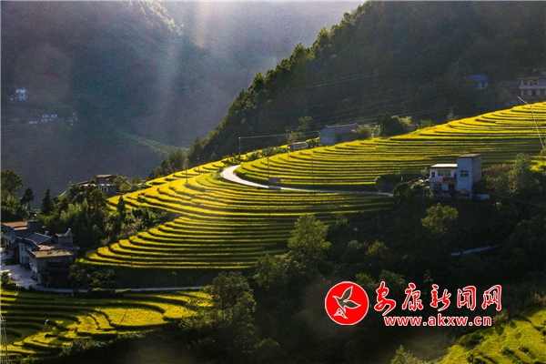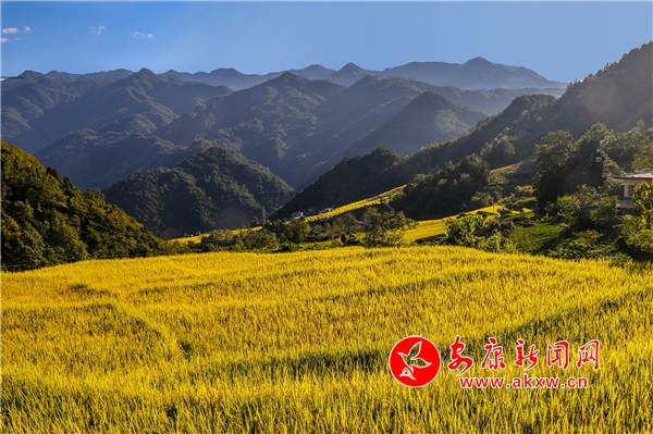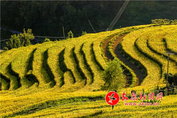 放眼望去,黃亮亮的稻谷,層層疊疊,從山底一直鋪到半山腰。水田都是依山而修,隨山形而變,高差均是隨坡放緩,形狀雖不十分規(guī)則卻也精巧,動人之處全在自然的水平線上。