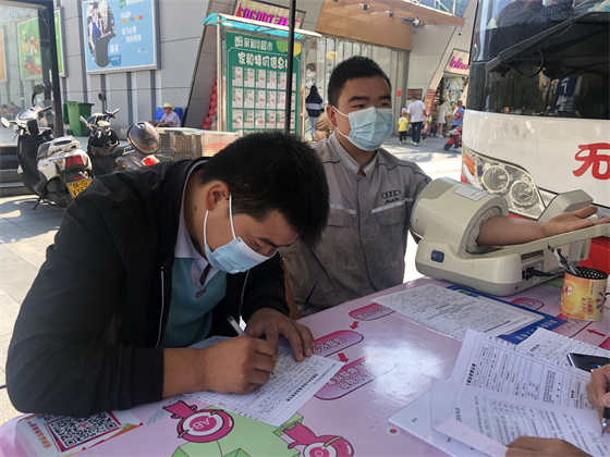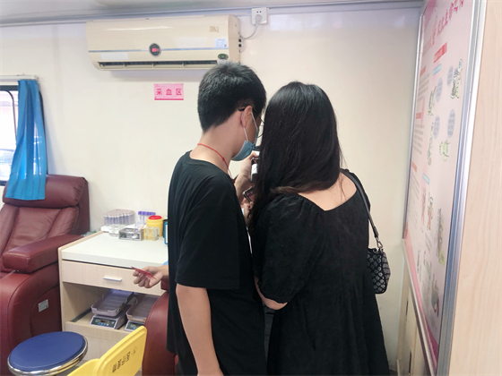 中秋節(jié)不僅街上熱鬧,獻血車上也熱鬧,鄧孟杰正坐在采血椅上獻血,他漂亮大方的女友站在旁邊跟他聊著晚上要吃什么,女友的弟弟坐在遠一點的地方玩著手機,女友的媽媽則坐在體檢桌前測量血壓,“一人獻血,三人陪同”的場景著實有點可愛,但鄧孟杰笑得十分開心,一直想獻血的他特別選了中秋這個日子,大概也是想和愛人親人一起分享這種美妙的人生體驗。鄧孟杰的女友拿起他的獻血證撒嬌到:“這次我們陪你,下次你也要陪我來獻血?!闭f完把手機塞給了一旁的弟弟,指揮他給自己和男友拍合照,一邊打趣弟弟拍照技術(shù)不好一邊把男友手里獻血證的位置調(diào)了又調(diào)。