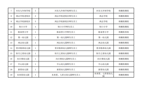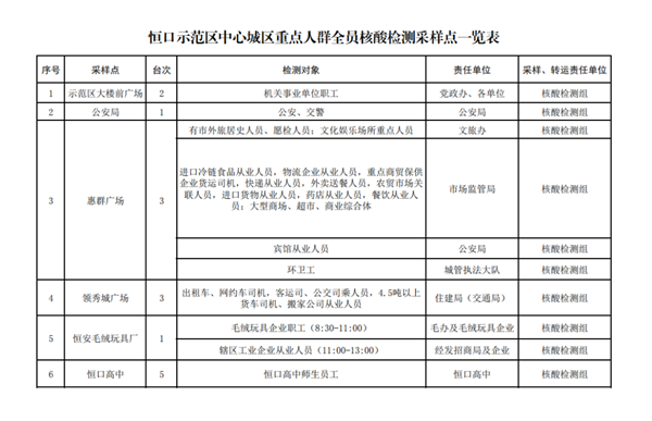 按行業(yè)、類(lèi)別、區(qū)域,共設(shè)置19個(gè)采樣點(diǎn)、40個(gè)采樣臺(tái)(見(jiàn)附件),具體由各行業(yè)牽頭部門(mén)、責(zé)任單位統(tǒng)一安排采樣點(diǎn)設(shè)置、人員組織、秩序維護(hù),檢測(cè)對(duì)象按照牽頭部門(mén)、責(zé)任單位的具體要求,分時(shí)段有序到指定地點(diǎn)進(jìn)行采樣,避免人群聚集。