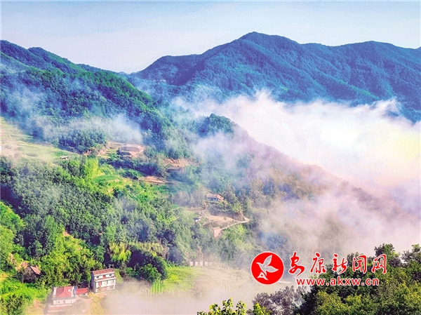 霧在山崖,白茫茫,棉花般鋪開,太陽高高掛在云海之上,青峰若隱若現(xiàn),車鉆云穿霧,人飄然若仙,撲哧驚飛的鳥兒,在樹梢上撒歡。