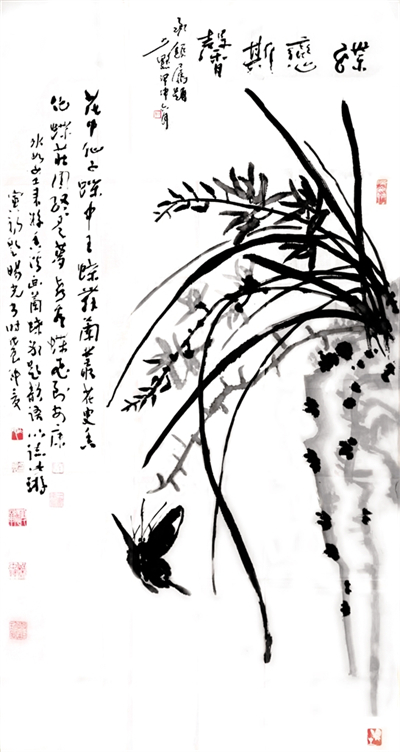 1988年,中國畫壇號稱“蝶王”的王冰如女士,以80歲高齡回到她曾工作生活10年之久的第二故鄉(xiāng)安康舉辦畫展,并且以詩書畫會友,特邀旸光先生和金州著名詩人劉寅初老人同游香溪,冰如老師興之所至,巧繪墨蝶,說道“人言寅初老弟有曹子健七步成詩之才,今日以十步為限,將此畫為題,賦詩一首,旸光老弟書于其上如何?”寅初老只走了三步便道有了,于是順口吟誦,旸光先生揮毫急就“花中仙子蝶中王,蝶舞籣叢花更香,化蝶莊周終是夢,喜看蝶王飛安康?!币还P流暢的行草躍然于畫上,相輔相成,真是詩情畫意天作之合。一幅難遇難得難覓的“三絕圖”誕生了。冰如老師感慨萬千,說到“二位弟臺才高八斗,只可惜待在安康這個貧瘠的地方被埋沒了也!”這個場面是一種巧合,正是旸光先生“萬事隨緣”的結(jié)晶,爾后經(jīng)書壇大家陳少默先生為之題跋做款,更是錦上添花,成了四絕圖。冰如、少默、旸光、寅初先生已然作古,這段翰墨丹青之情,將永存世間傳為藝術佳話。