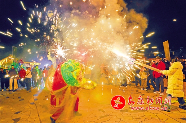 夜幕降臨,在中壩作坊小鎮(zhèn)廣場(chǎng)上,音樂(lè)響起,熊熊篝火燃燒,伴隨著動(dòng)感的音樂(lè),游客與居民們手牽手,肩并肩,圍著篝火載歌載舞。而最吸引人的還是舞火龍、火獅子表演,在璀璨煙火中,火龍飛舞盤(pán)旋,火獅子搖頭晃腦,騰挪跳躍,威風(fēng)八面,現(xiàn)場(chǎng)不少游客噴起煙花,花燒得越旺、鑼鼓聲越急,獅子舞得也越歡快,大家共同享受著這場(chǎng)精彩紛呈的非遺文化盛宴。