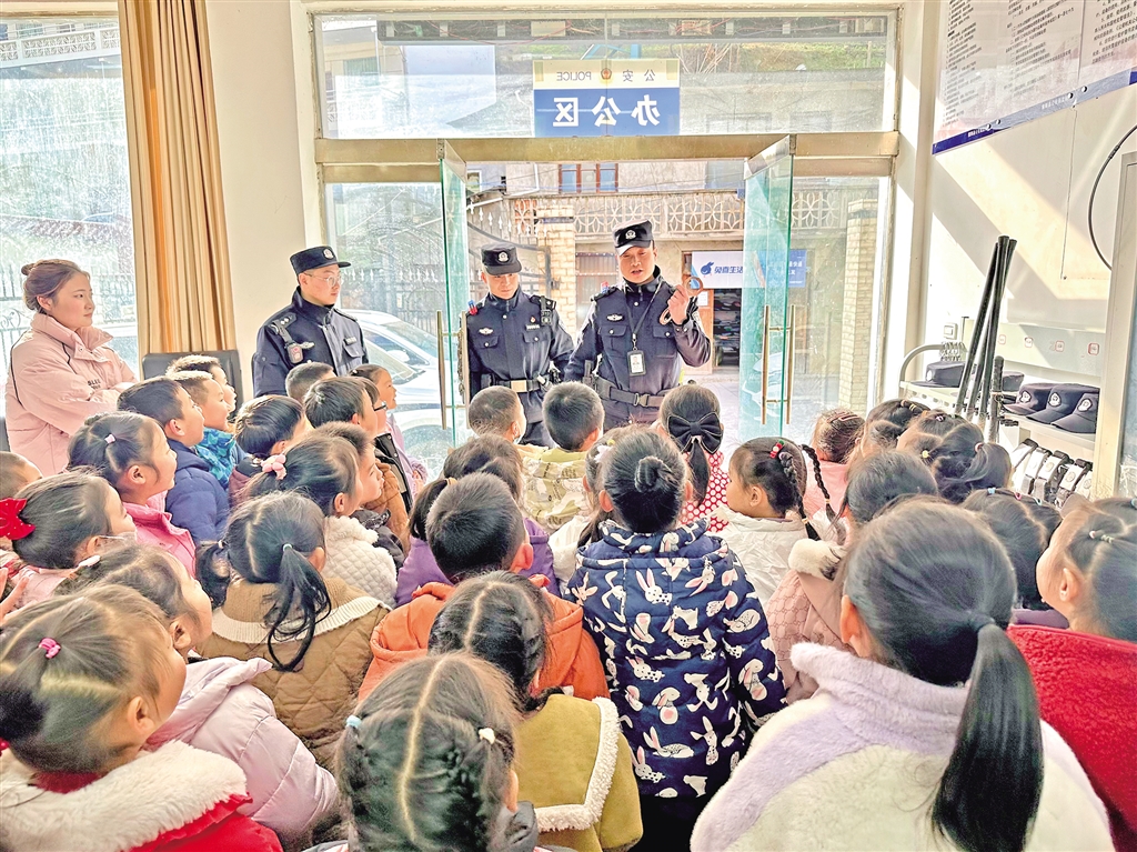 1月8日,紫陽(yáng)縣公安局高橋派出所舉行“萌娃進(jìn)警營(yíng) 警心伴童心”主題110宣傳日警營(yíng)開(kāi)放活動(dòng),邀請(qǐng)轄區(qū)學(xué)校師生走進(jìn)警營(yíng),感受警營(yíng)文化。陳益謙 攝