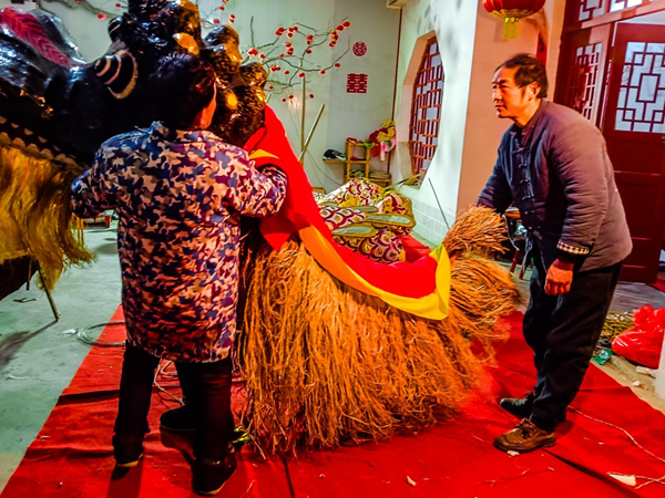 “龍頭是整條龍的重點(diǎn),刻畫要逼真,色彩還得鮮艷。忙碌了一年的鄉(xiāng)親們,就希望在正月里,抖擻精神,舞動(dòng)起來?!闭f話間,李忠寶一雙巧手上下翻飛,正在修剪龍頭花燈的胡須,忙得額頭沁出了汗珠。兒子李石磊則忙著幫烤、粘、填、糊、上色……在他們父子倆的精雕細(xì)琢下,一個(gè)威風(fēng)凜凜、栩栩如生的花燈道具龍頭,總算扎制完成。