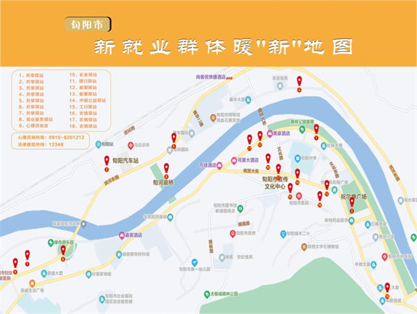 為提升服務效能,讓更多新就業(yè)群體享受到便捷的暖新服務,旬陽市委社會工作部特別制作了暖“新”地圖,將城區(qū)18處共享驛站具體位置精準標注在地圖上,可一目了然找到距離最近的驛站。此外,暖“新”地圖還提供了旬陽心理咨詢熱線和“12348”法律援助熱線,全方位服務新就業(yè)群體。?