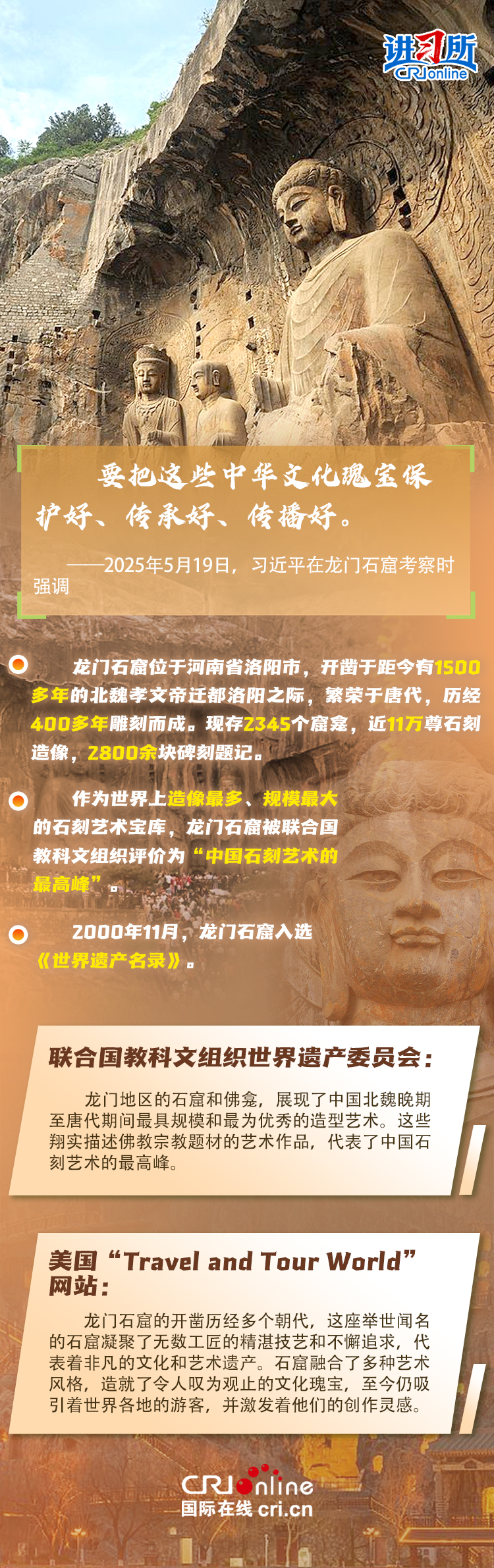 龍門石窟被聯(lián)合國教科文組織評價為“中國石刻藝術(shù)的最高峰”,與敦煌莫高窟、云岡石窟、麥積山石窟并稱為“中國四大石窟”,具有重要歷史價值、文化價值。近年來,習(xí)近平先后考察了中國四大石窟。對這些承載著中華民族文化基因和血脈的文物和文化遺產(chǎn),習(xí)近平強調(diào),“保護好、傳承好歷史文化遺產(chǎn)是對歷史負責(zé)、對人民負責(zé)?!?/p>