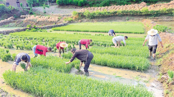 只見水田中村民們排成整齊的隊列,左手攥秧苗,右手飛快地從秧把中分出幾株,拇指與食指輕捻,穩(wěn)穩(wěn)插入泥中。彎腰、分苗、插秧,整套動作一氣呵成,不過兩三秒。濕潤的泥土裹挾著稻苗的清香,在插秧的節(jié)奏中升騰,勾勒出傳統(tǒng)農(nóng)耕的詩意與韻律?!皠e看這插秧動作簡單,講究可不少。秧苗入土深度要適中,太淺容易漂,太深影響生長?!蓖鯆鹬逼鹧亮税押梗澞_沾滿泥漿卻笑得開懷,“這手藝都是祖輩傳下來的,我們種了一輩子地,只盼著秧苗茁壯成長?!?/p>
