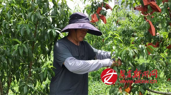 同樣迎來收獲的還有城關鎮(zhèn)的黃桃,在城關鎮(zhèn)龍嶺村的黃桃種植基地,連片的桃樹郁郁蔥蔥,金燦燦的黃桃壓彎了枝條,空氣中彌漫著誘人的桃香?;刎撠熑藙⒑暾χ烧?,臉上洋溢著燦爛的笑容,他一邊采摘一邊介紹道:“我們這個桃園有金鳳黃桃、黃金黃桃、秋彤桃和冬桃四個品種,一共有9畝多,從6月中旬到10月左右,陸續(xù)都有成熟的桃子?!?/p>