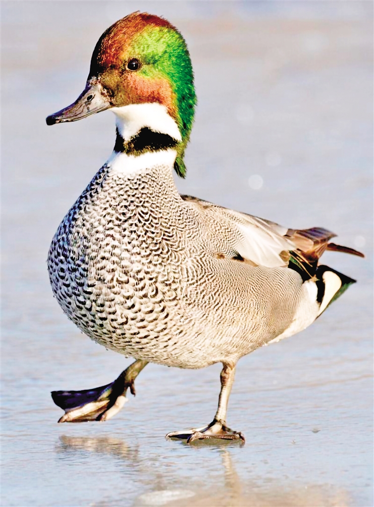 又名葭鳧、鐮刀鴨、扁頭鴨、早鴨、三鴨。雄鳥頭頂至后頸栗色,頭側及冠羽銅綠色;前頸基部有一黑色領環(huán),上體淺灰色,密布暗褐色波狀細紋;翼鏡綠黑色,三級飛羽延長呈鐮狀;胸黑色密布白色新月形斑,尾下覆羽絨黑色;兩側具乳黃色斑塊,腋下白色;雌鳥體羽多黑褐色而具黃褐色羽緣,形成明顯的“V”形斑;虹膜褐色,嘴黑灰色,腳暗灰色。因胸、腹、脅部密布由大漸小的黑白波紋,排列成有序的特異圖案,形似編織物而故名。