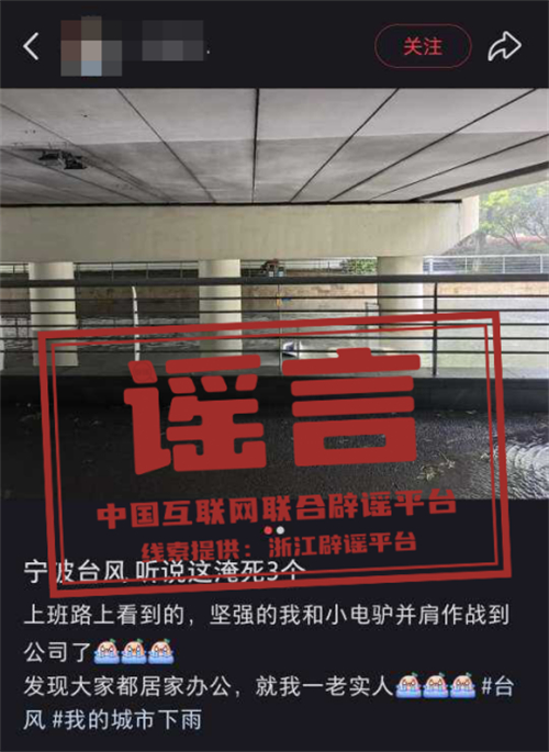 真相:7月30日9時許,某社交平臺網(wǎng)民沈某(女,23歲,寧波鄞州人)發(fā)帖造謠稱“寧波一涵洞內(nèi)車輛被淹,有3人淹死”。經(jīng)核查,該內(nèi)容系謠言,目前公安機關已對沈某依法予以批評教育,該帖文現(xiàn)已刪除。