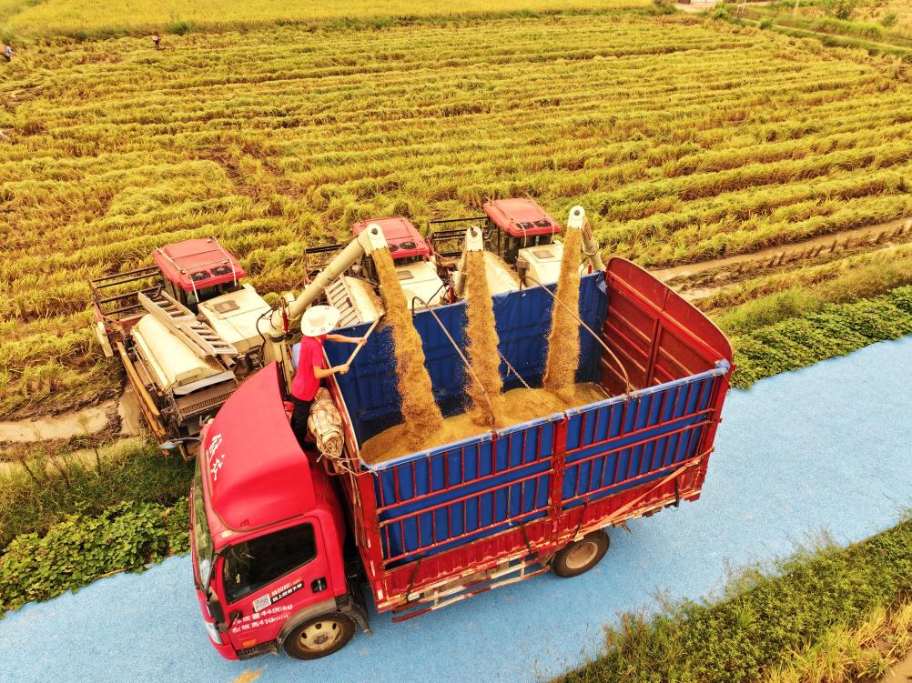 近日,四川省達(dá)州市渠縣有慶鎮(zhèn)太陽(yáng)村農(nóng)民轉(zhuǎn)運(yùn)剛收獲的水稻(無(wú)人機(jī)照片)。白露節(jié)氣之際,各地農(nóng)民搶抓農(nóng)時(shí),田間地頭一片農(nóng)忙景象。新華社發(fā)(鄧良奎 攝)