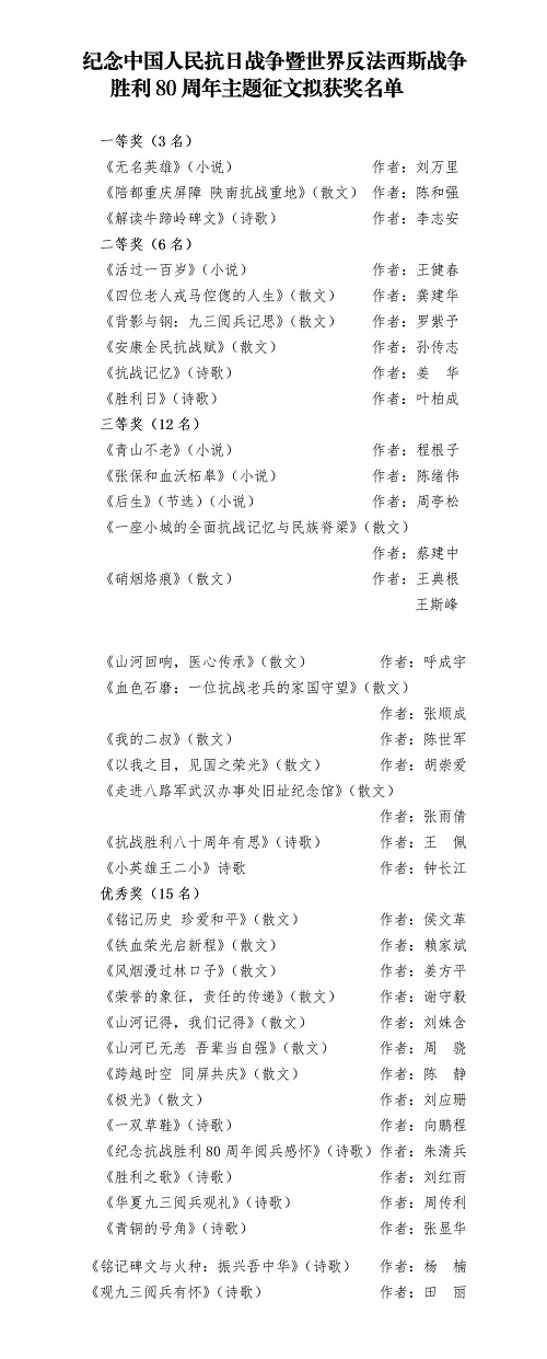紀(jì)念中國人民抗日戰(zhàn)爭暨世界反法西斯戰(zhàn)爭勝利80周年主題征文評(píng)審結(jié)果公示