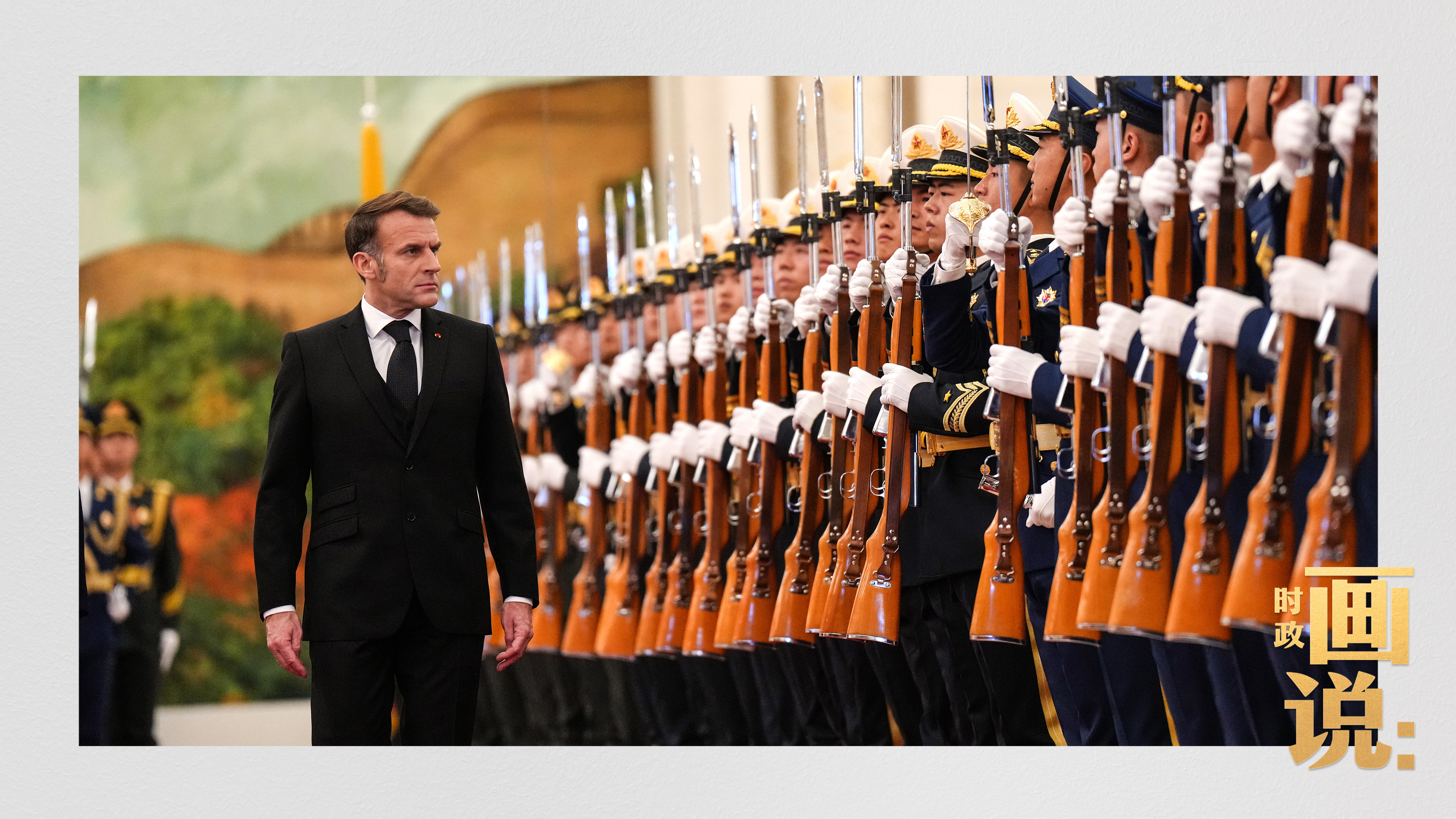△馬克龍?jiān)诹?xí)近平陪同下檢閱中國人民解放軍儀仗隊(duì)并觀看分列式