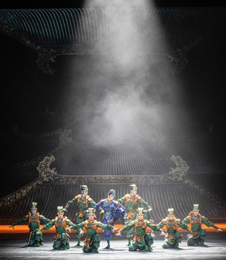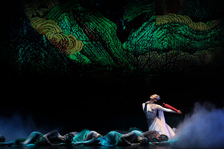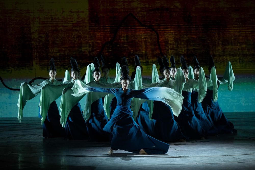 這是舞蹈詩(shī)劇《只此青綠》的演出劇照(2024年7月18日攝)?!吨淮饲嗑G》采用平行空間的敘事方式,從故宮博物院青年研究員的“展卷人”視角出發(fā),講述北宋著名畫(huà)家王希孟創(chuàng)作《千里江山圖》的故事。該劇連續(xù)3年穩(wěn)居中國(guó)舞劇票房榜首,全國(guó)巡演超800場(chǎng),赴多個(gè)國(guó)家和地區(qū)演出50余場(chǎng),成為傳統(tǒng)文化創(chuàng)新表達(dá)、中國(guó)藝術(shù)國(guó)際表達(dá)的典范之作。