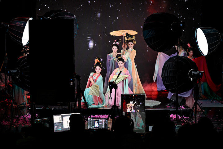 陜西省歌舞劇院的舞蹈演員在直播間進(jìn)行“團(tuán)播”表演(2025年12月25日攝)?!皥F(tuán)播”這一多人演藝直播新形式,正成為專業(yè)文藝院團(tuán)開(kāi)辟線上“第二舞臺(tái)”、推動(dòng)傳統(tǒng)文化創(chuàng)新表達(dá)的新嘗試。“豎屏化”“快節(jié)奏”的改編,讓傳統(tǒng)劇目受到越來(lái)越多年輕人喜愛(ài)。數(shù)據(jù)顯示,陜西省歌舞劇院“團(tuán)播”單場(chǎng)最高曝光量超500萬(wàn),帶動(dòng)線下票房增長(zhǎng)約10%。