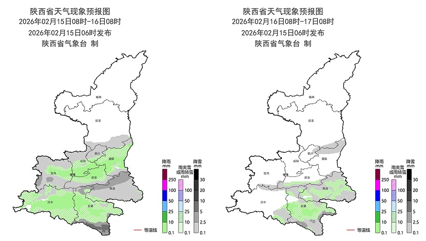 雨雪過程期間陜北南部、關(guān)中北部、秦巴山區(qū)小到中雪或雨夾雪(0.1~5毫米),關(guān)中南部、陜南為雨夾雪或小雨(0.1~5毫米),陜南南部局地有中雨(10~15毫米);雨雪落區(qū)2月15日在陜北南部、關(guān)中、陜南,16 日(除夕)至17日(初一)在陜南。受雨雪影響,2月15日夜間至16日(除夕)清晨全省大部能見度較低,秦巴山區(qū)局地有大霧。2月14日至15日和21日(初五)全省大部有4~5級(5.5~10.7米/秒)偏北風(fēng),陣風(fēng)6~7級(10.8~17.1米/秒),其中2月21日(初五)中北部部分地方伴有揚(yáng)沙或浮塵。兩次降溫均屬于中等強(qiáng)度,日平均氣溫全省大部下降4~6℃,陜北北部、秦嶺山區(qū)下降6~8℃。