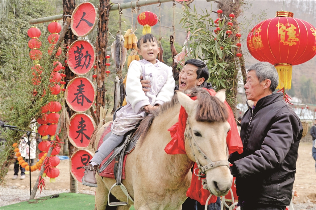 春節(jié)期間,寧陜縣城關(guān)鎮(zhèn)漁灣村舉行“回寧陜過大年”民俗展演。圖為游客體驗(yàn)?zāi)晁谆顒?。楊?攝