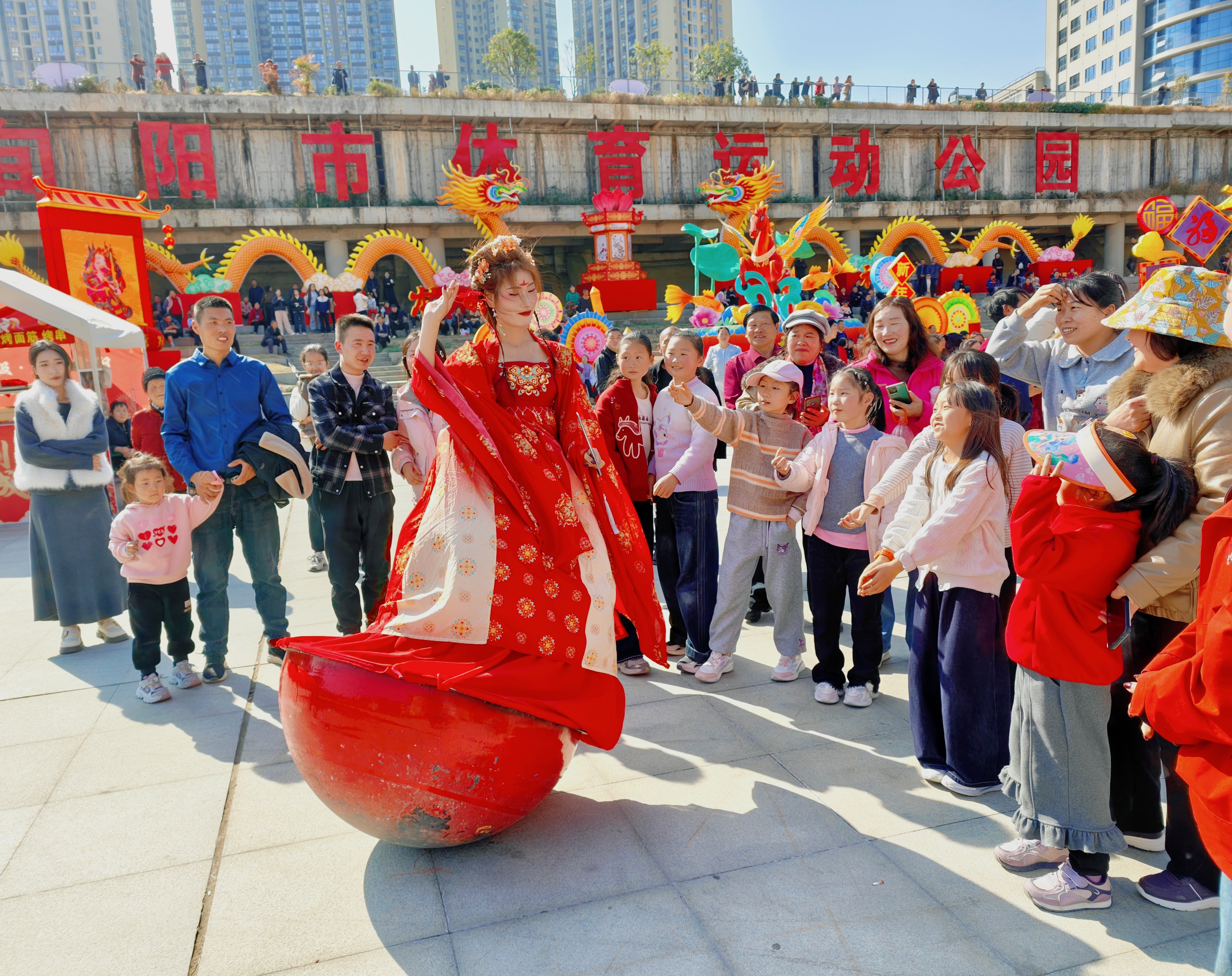 春節(jié)期間,瀛湖漢水街文旅影視基地?zé)狒[非凡。圖為游客們欣賞基地精心準(zhǔn)備的表演。張忠 攝