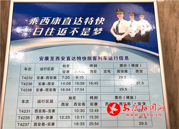 此次新增開的直達(dá)特快,從2020年1月10日起,安康至西安南每日開行3對(duì),早上、中午、下午各1對(duì),具體時(shí)刻為:T4232次安康早上7:20開、西安南9:10到;T4236次安康中午14:08開、西安南15:58到、西安16:45到;T4238次安康下午16:04開、西安南17:54到。在票價(jià)方面,本次直達(dá)特快安康至西安南間硬座票價(jià)29.50元,安康至西安間硬座票價(jià)37.50元。3對(duì)直達(dá)特快提供硬座、軟臥、硬臥不同席位,以滿足不同旅客出行需求。FHp安康新聞網(wǎng)