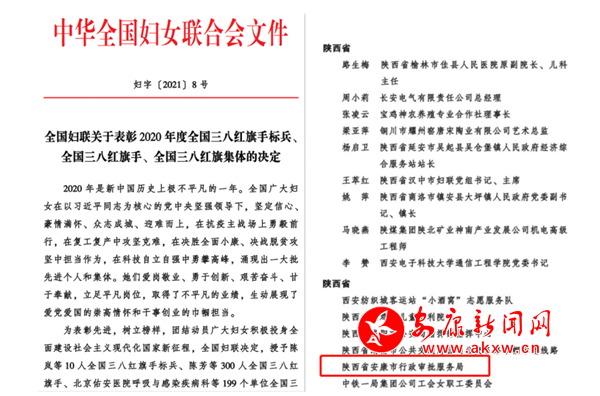 本網(wǎng)訊(通訊員 李倩)“三八”國際勞動婦女節(jié)前夕,全國婦聯(lián)表彰了一批全國三八紅旗手標兵、全國三八紅旗手和三八紅旗集體。安康市行政審批服務(wù)局榜上有名,作為全省六個、全市唯一的單位,榮獲“全國三八紅旗集體”榮譽稱號。
