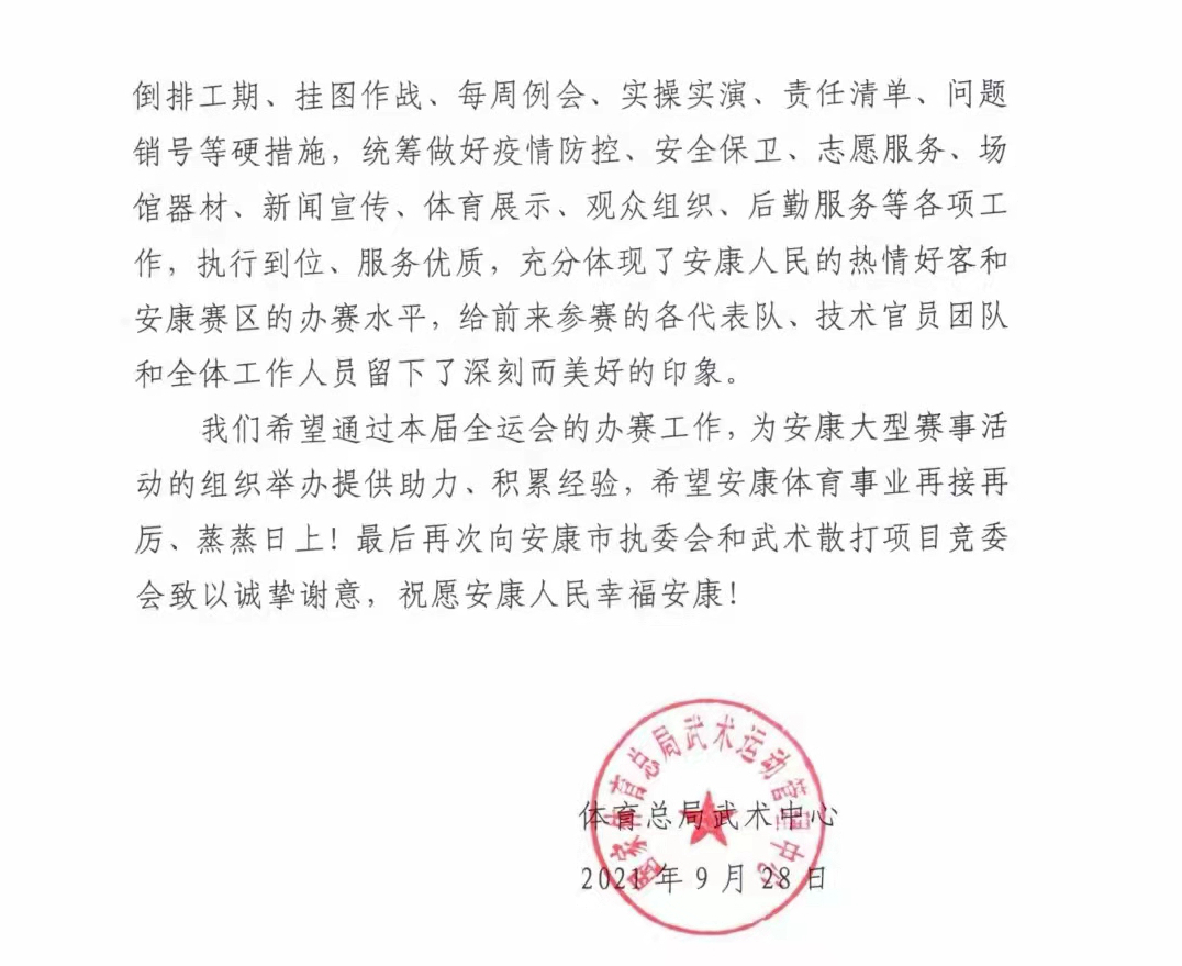 本網(wǎng)訊 9月28日,國家體育總局武術運動管理中心向我市發(fā)來感謝信,對我市高質量的競賽組織和服務保障等工作表示感謝。RyT安康新聞網(wǎng)