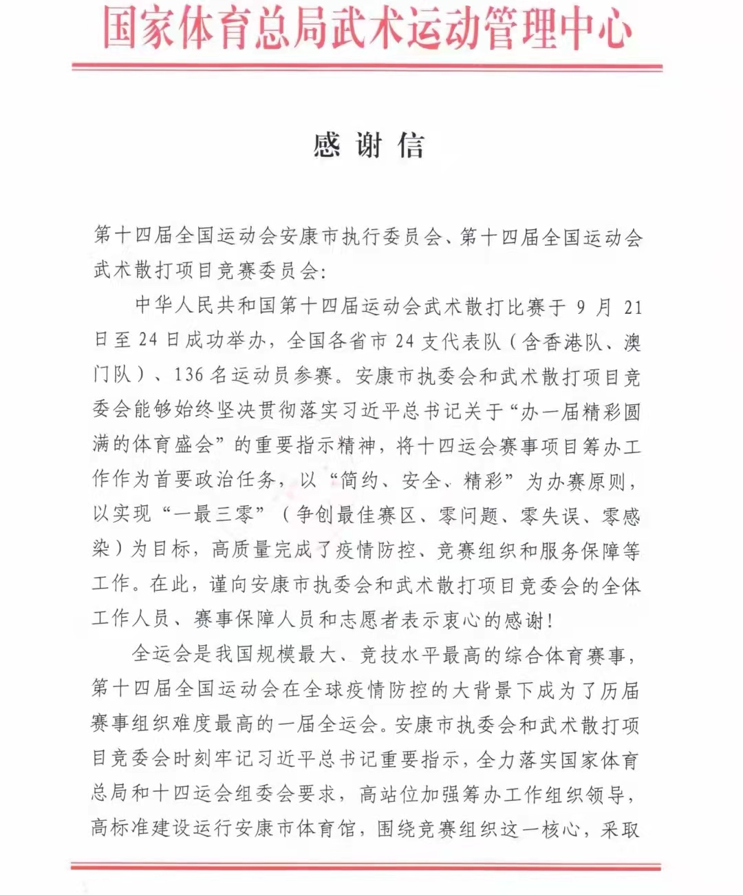 國家體育總局武術運動管理中心向我市發(fā)來感謝信