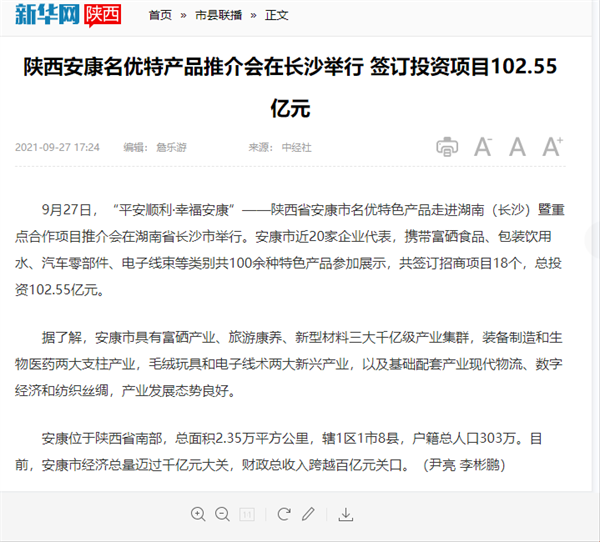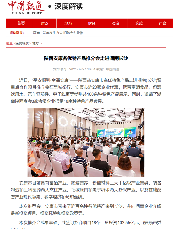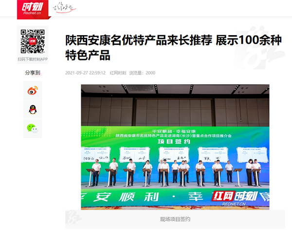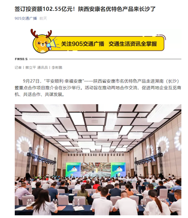本網訊 9月27日,由中共安康市委、安康市人民政府,陜西省商務廳聯(lián)合主辦的“平安順利·幸福安康——陜西省安康市名優(yōu)特色產品走進湖南(長沙)暨重點合作項目推介會”在長沙市成功舉辦。新華社、中國交通廣播、中國報道、湖南日報、長沙晚報、三湘都市報、國際在線、紅網等中省、長沙以及駐長多家媒體紛紛給予報道。媒體不僅高度贊揚兩地的合作成果,并對安康有了一個嶄新的評價和認識。一起看看“老親戚”長沙眼中的“老鄰居”安康是什么樣!B2S安康新聞網