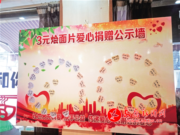 “感謝XX蕊捐款10元,感謝馬遠(yuǎn)鵬律師捐款20元,感謝XX默為環(huán)衛(wèi)工人認(rèn)購燴面片10份捐款30元,感謝山茶花捐款80元,感謝XX娃捐款300元……”大廳西墻壁新設(shè)置的“愛心捐款公示墻”上,貼滿了連日來通過微信、現(xiàn)金等方式,認(rèn)購燴面片的愛心人士的昵稱和捐款金額。bnW安康新聞網(wǎng)