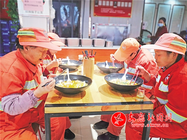 十幾年前,向美玉從湖南遠(yuǎn)嫁至安康,幾年前加入了“城市美容師”的行列,負(fù)責(zé)清掃城區(qū)高井加油站附近的街面,平日起早貪黑,緊趕慢趕,區(qū)域內(nèi)衛(wèi)生才能保持干凈。如果中途回家吃個(gè)飯,就太耽誤時(shí)間了。得知天源飯莊為環(huán)衛(wèi)工人準(zhǔn)備了熱氣騰騰的燴面片,她便和同事一起過來就餐。“冬天能吃一碗美味的燴面片,我們心里暖暖的,感謝老板和愛心人士對我們的關(guān)愛。”向美玉說。bnW安康新聞網(wǎng)