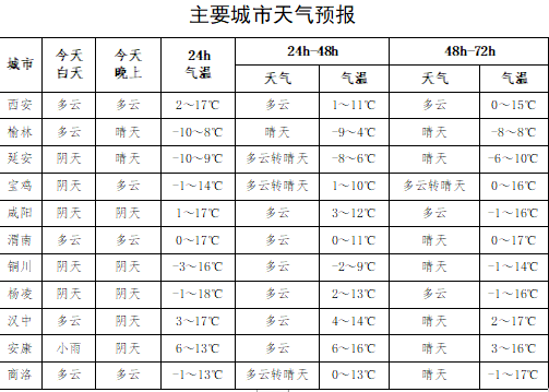 4日:陜北、關中多云轉晴天,陜南多云。陜北、關中北部有6級左右西北風,日平均氣溫陜北、關中北部下降6℃左右,局地可達8℃。陜北、關中北部部分地方有沙塵天氣。T93安康新聞網