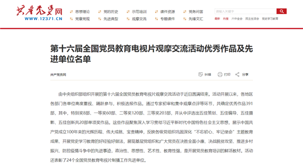 由中央組織部組織開展的第十六屆全國黨員教育電視片觀摩交流活動近日圓滿結束,全國共391部優(yōu)秀作品和24個先進單位獲獎。Rii安康新聞網
