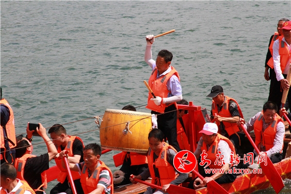 上午10時(shí)許,龍舟文化園禮炮轟鳴,數(shù)百健兒痛快地飲下“摔碗酒”,隨后依次登上自己隊(duì)伍的龍舟。紅色、黃色、紫色的龍舟整齊劃一地停靠在江邊,龍頭高昂,龍尾高翹,槳櫓浮動(dòng),旗幟飄揚(yáng)。聞聲而來(lái)的群眾齊聚兩岸,駐足圍觀?傊笓]一聲哨響,木槳齊動(dòng),龍舟似箭掠過(guò)無(wú)垠江面直逼江心,留下層層白浪;一艘艘或逆流勇進(jìn),或順流而下,或徑直橫渡,瞬間點(diǎn)燃觀眾激情,不時(shí)引得大家齊聲吶喊。號(hào)子聲、鑼鼓聲、吶喊聲、歡呼聲,此起彼伏,聲聲震天。隊(duì)員們跟隨著鼓點(diǎn)賣力地劃槳,舵手隨著龍舟行進(jìn)的方向不停調(diào)整把舵,龍舟的速度不斷加快,再快,更快。