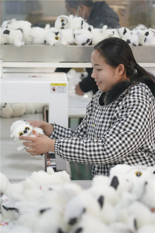 安康市漢濱區(qū)五里鎮(zhèn)朝陽(yáng)社區(qū)一家新社區(qū)工廠生產(chǎn)的毛絨玩具產(chǎn)品(2月22日攝)。新華社記者邵瑞攝