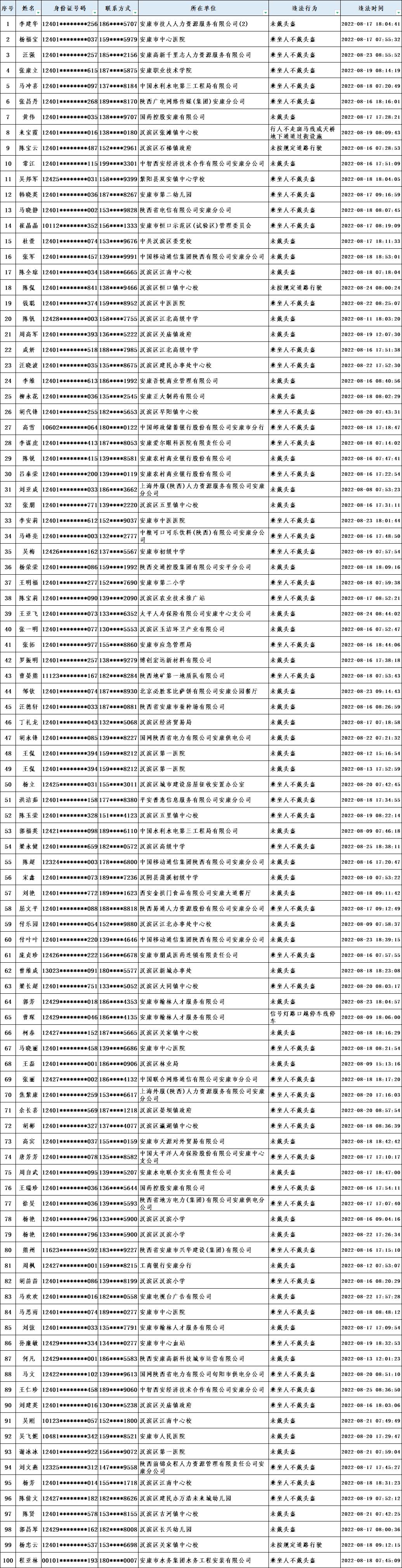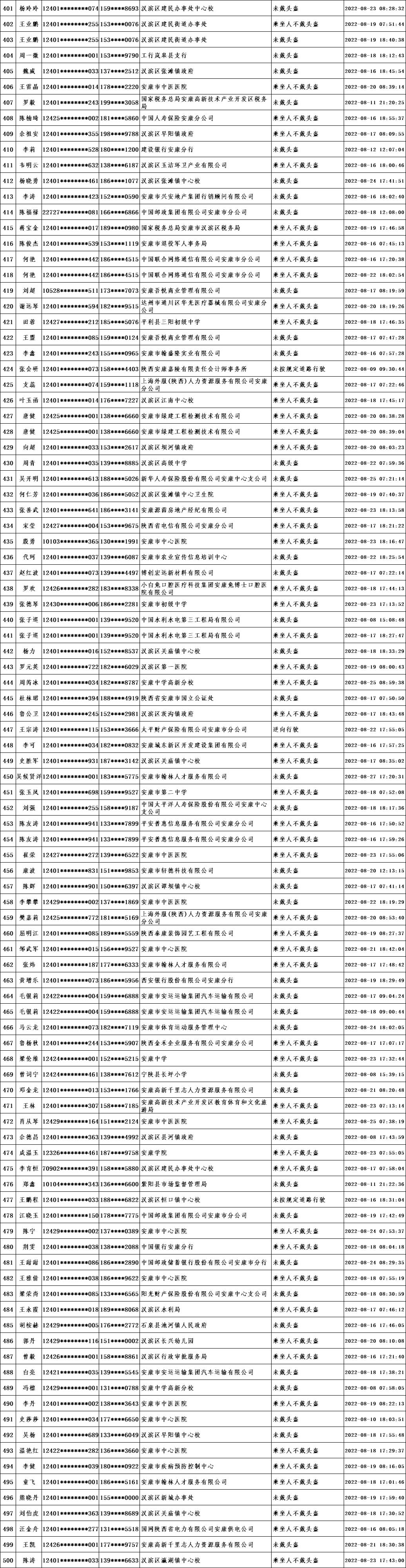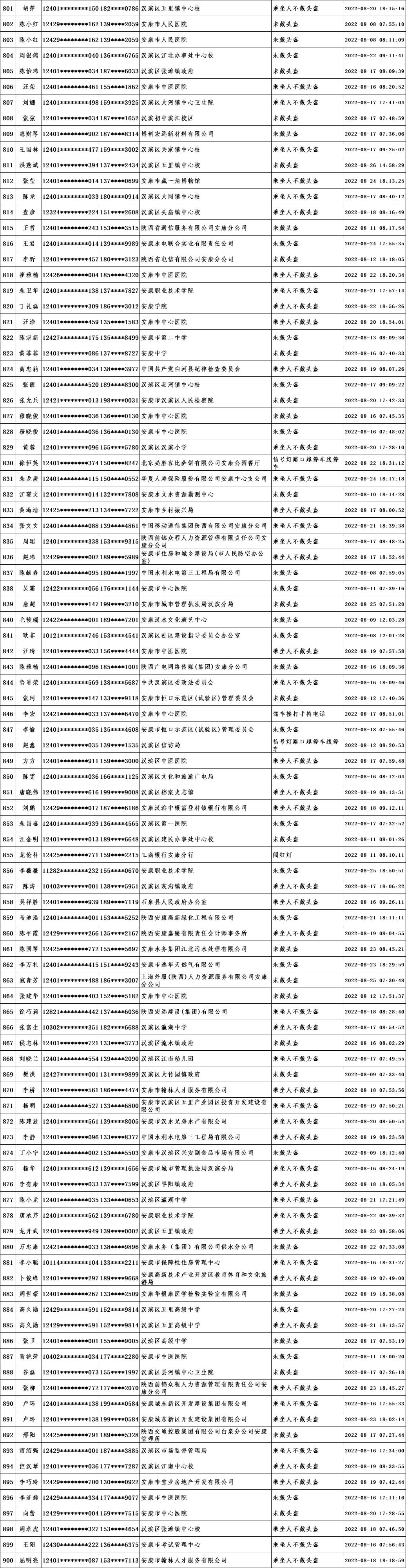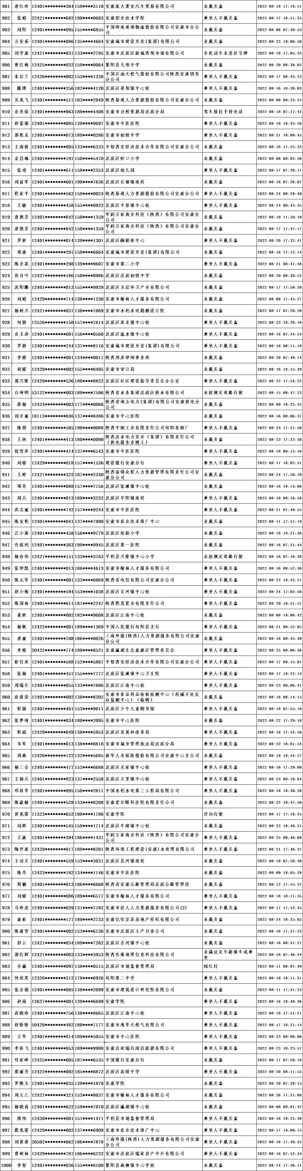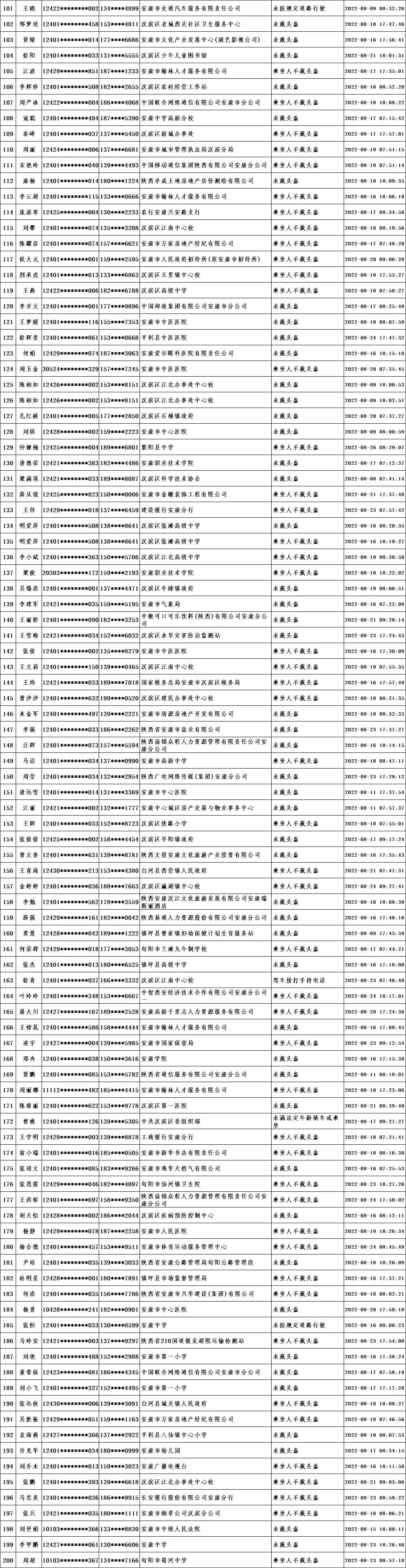 當(dāng)前,我市文明城市創(chuàng)建進(jìn)入沖刺階段,為深入推進(jìn)全國文明城市創(chuàng)建工作,引導(dǎo)廣大市民自覺遵守交通規(guī)則,共同營造文明交通環(huán)境,根據(jù)漢濱公安分局交警大隊(duì)提供的交通違法數(shù)據(jù),對近期城區(qū)道路交通違法情況進(jìn)行通報(bào)。希望廣大市民引以為鑒,自覺踐行“開文明車、走文明路、做文明人”,特別是公職人員要做到“文明創(chuàng)建我示范、文明禮讓我先行”,并教育引導(dǎo)家人、身邊人自覺遵守交通規(guī)則。各交通違法人員所在單位要全面加強(qiáng)干部職工教育管理,對交通違法人員進(jìn)行提醒教育,舉一反三,扎實(shí)整改,堅(jiān)決杜絕再次發(fā)生類似交通違法行為,以實(shí)際行動為全國文明城市創(chuàng)建作出貢獻(xiàn)。