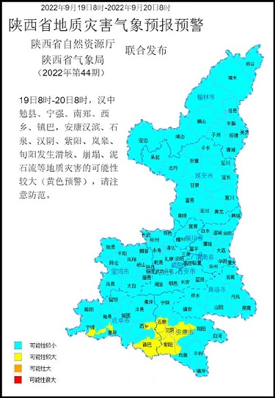 陜西省自然資源廳與陜西省氣象局聯(lián)合發(fā)布地質(zhì)災(zāi)害氣象預(yù)報(bào)預(yù)警:預(yù)計(jì)2022年9月19日8時(shí)至2022年9月20日8時(shí),漢中勉縣、寧強(qiáng)、南鄭、西鄉(xiāng)、鎮(zhèn)巴,安康漢濱、石泉、漢陰、紫陽(yáng)、嵐皋、旬陽(yáng)發(fā)生滑坡、崩塌、泥石流等地質(zhì)災(zāi)害的可能性較大(黃色預(yù)警),請(qǐng)注意防范。