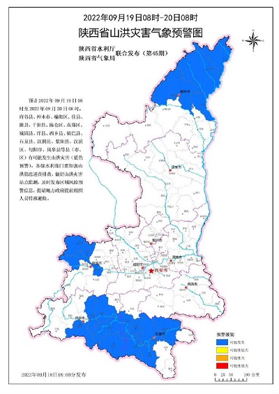 陜西省水利廳與陜西省氣象局聯(lián)合發(fā)布山洪災(zāi)害氣象預(yù)警:預(yù)計(jì)2022年09月19日08時(shí)至2022年09月20日08時(shí),府谷縣、神木市、榆陽(yáng)區(qū)、佳縣、隴縣、千陽(yáng)縣、陳倉(cāng)區(qū)、南鄭區(qū)、城固縣、洋縣、西鄉(xiāng)縣、鎮(zhèn)巴縣、石泉縣、漢陰縣、紫陽(yáng)縣、漢濱區(qū)、旬陽(yáng)市、嵐皋縣等縣(市、區(qū))有可能發(fā)生山洪災(zāi)害(藍(lán)色預(yù)警)。各級(jí)水利部門要加強(qiáng)山洪隱患巡查排查,做好山洪災(zāi)害站點(diǎn)監(jiān)測(cè),及時(shí)發(fā)布區(qū)域風(fēng)險(xiǎn)預(yù)警信息,提請(qǐng)地方政府提前組織人員轉(zhuǎn)移避險(xiǎn)。