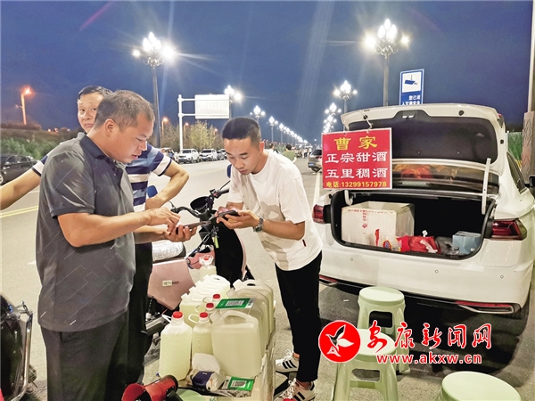 記者上前和他攀談起來,眼前這位能說會道的小伙子白天在漢濱區(qū)一家物業(yè)公司上班,下班后為了給自己再找點(diǎn)事干,他便會拉上20多桶自家做的稠酒到四橋底下售賣。兩個多月的時間,除了下雨,雷玉濤幾乎每天都來。“前期大家都不知道我在這里擺攤,我就發(fā)朋友圈和抖音,朋友們知道了又轉(zhuǎn)發(fā)傳播,后面來的顧客很多都是借助互聯(lián)網(wǎng)傳播來的新顧客。曹家稠酒在安康做了20多年,也算小有名氣,現(xiàn)在我每天帶來的稠酒基本上都能賣完,一天可以賺400多元。”