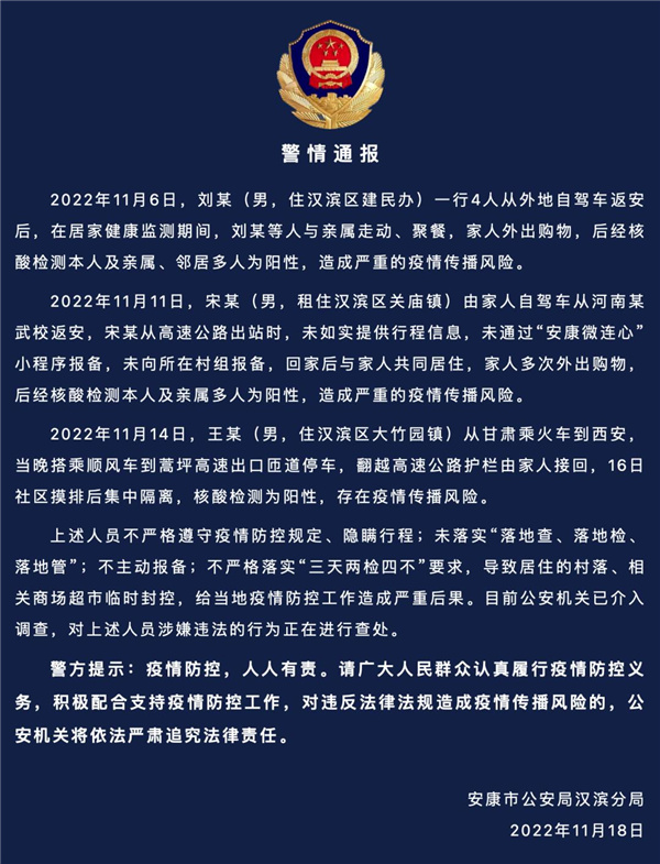 11月18日,漢濱區(qū)通報三起違反疫情防控工作典型案例