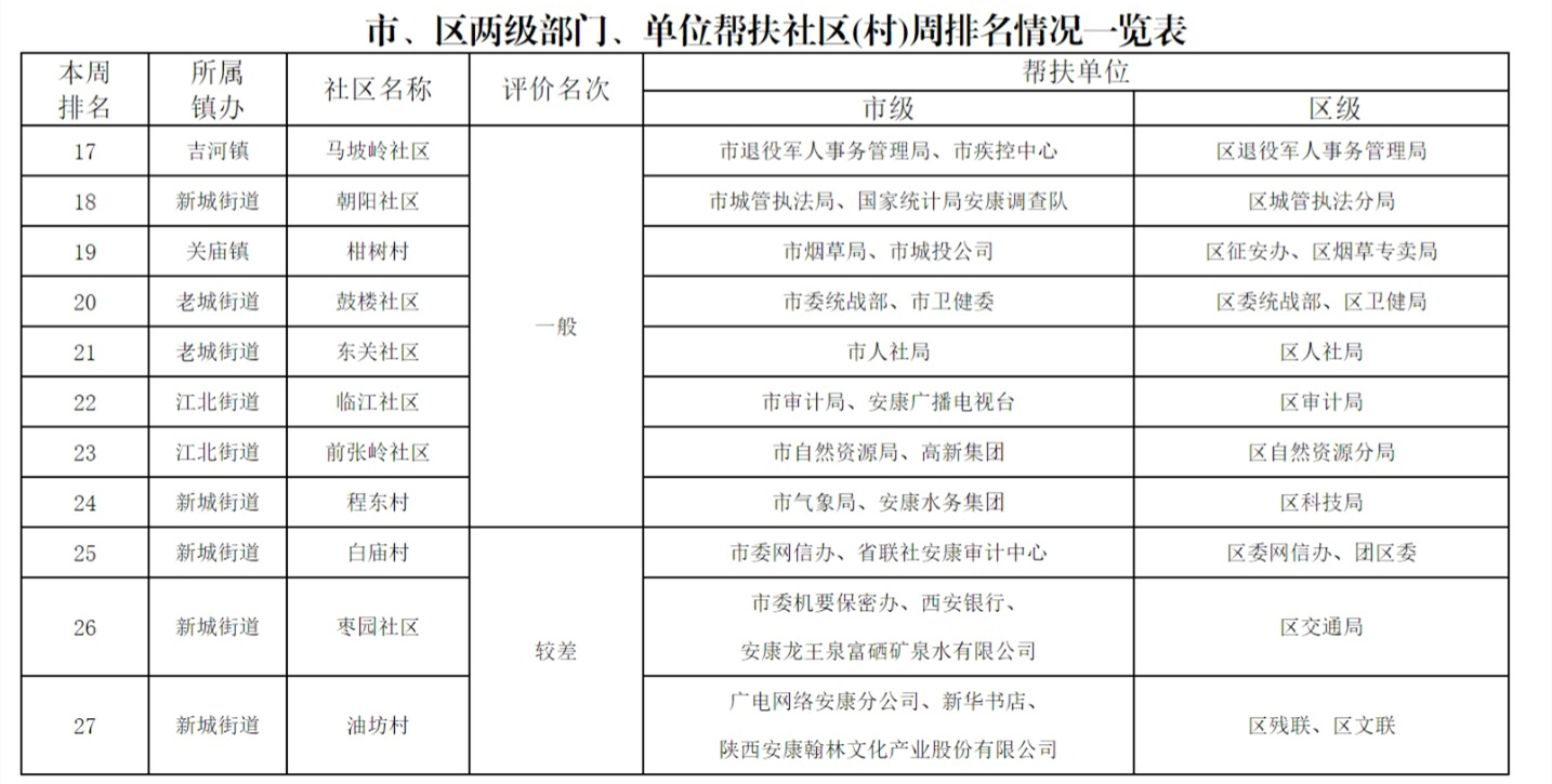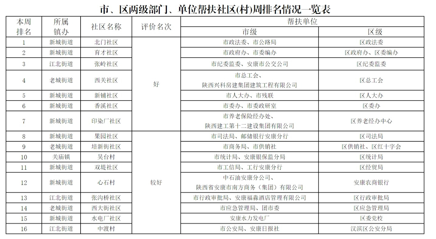 附件:市、區(qū)兩級部門幫扶社區(qū)(村)周排名情況一覽表gs6安康新聞網(wǎng)