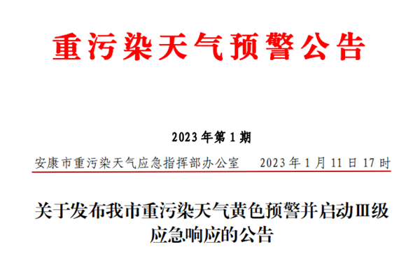 2023年1月11日17時,安康市重污染天氣應(yīng)急指揮部辦公室發(fā)布:關(guān)于發(fā)布我市重污染天氣黃色預(yù)警并啟動Ⅲ級應(yīng)急響應(yīng)的公告NCJ安康新聞網(wǎng)