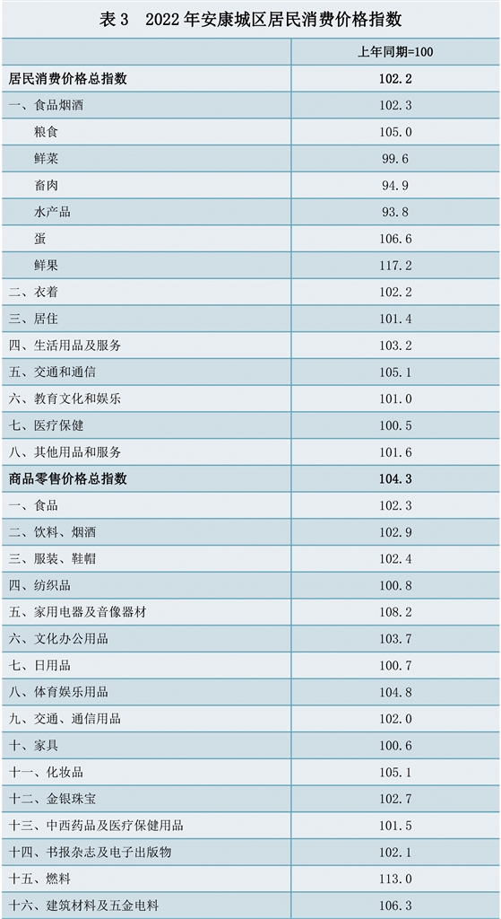 2022年,安康城區(qū)居民消費(fèi)價(jià)格比上年上漲2.2%。商品零售價(jià)格比上年上漲4.3%。2Kw安康新聞網(wǎng)