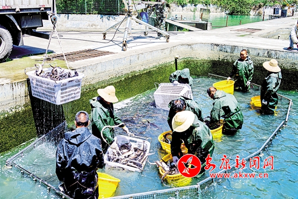 5月1日,嵐皋縣生態(tài)養(yǎng)殖基地的鱘龍魚喜獲豐收。 文彩琴 攝C7z安康新聞網