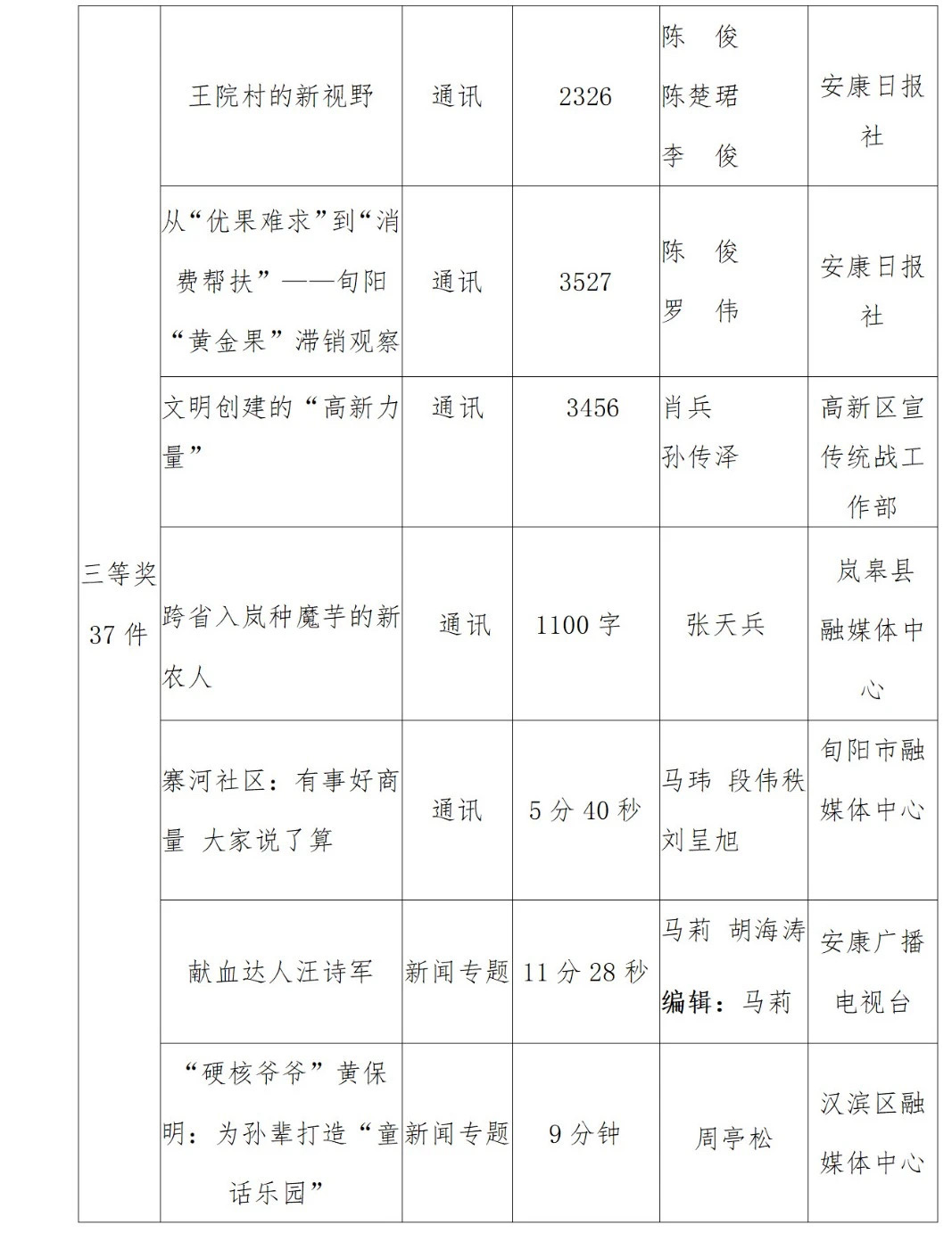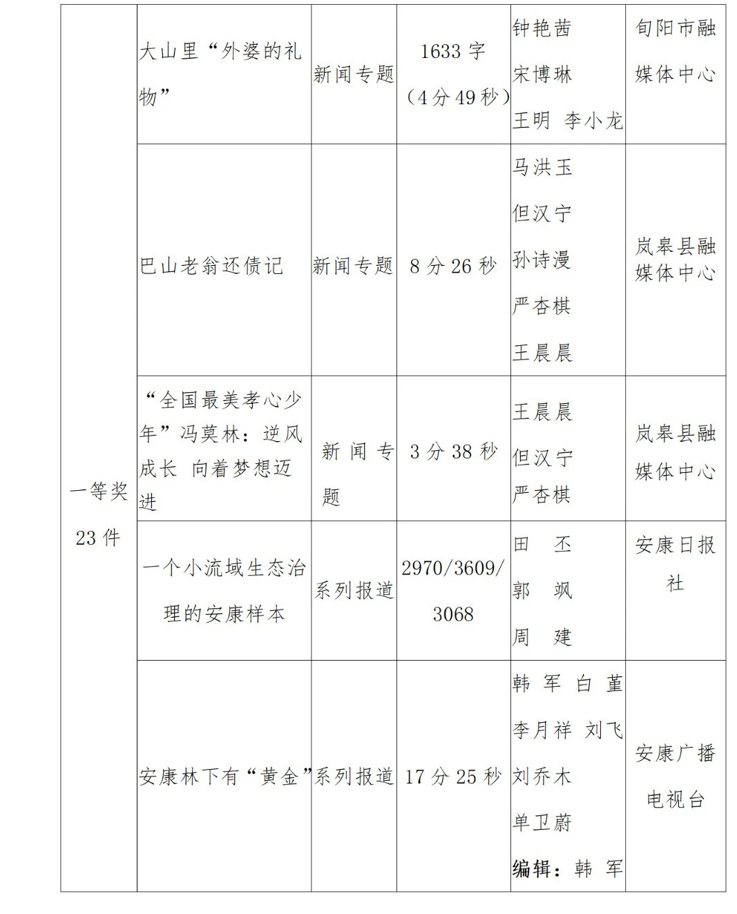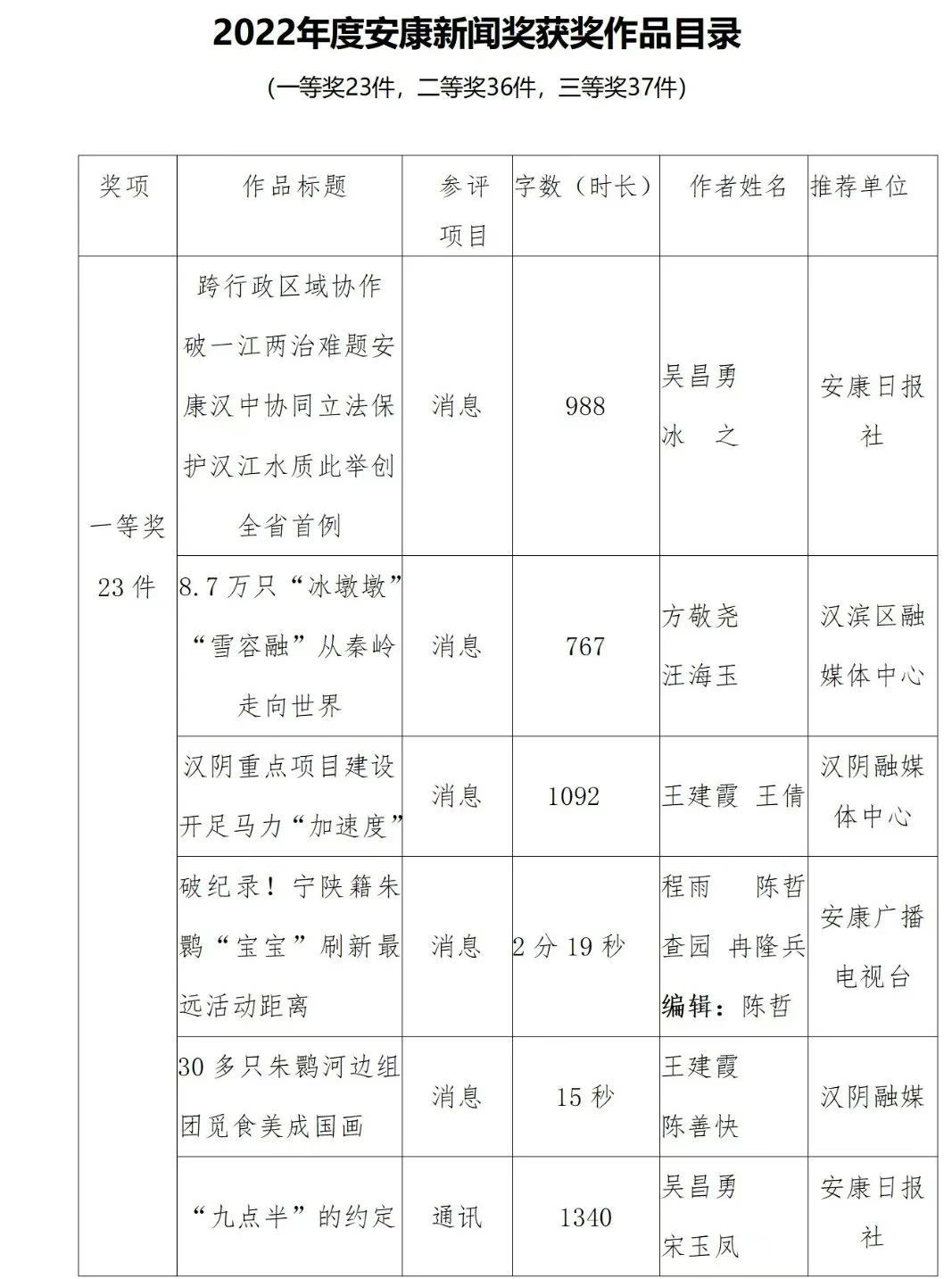 2022年度安康新聞獎評審工作在中共安康市委宣傳部的指導(dǎo)下,由市記協(xié)具體組織實(shí)施,經(jīng)過各申報(bào)單位推薦、初審,市記協(xié)復(fù)審并組織專家定評,評選出擬獲安康新聞獎作品96件,其中一等獎23件、二等獎36件、三等獎37件。擬授予姚登等14名同志“安康市優(yōu)秀新聞工作者”榮譽(yù)稱號。5ba安康新聞網(wǎng)