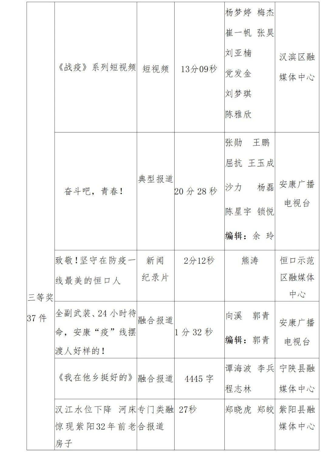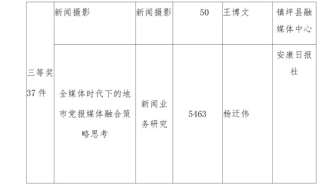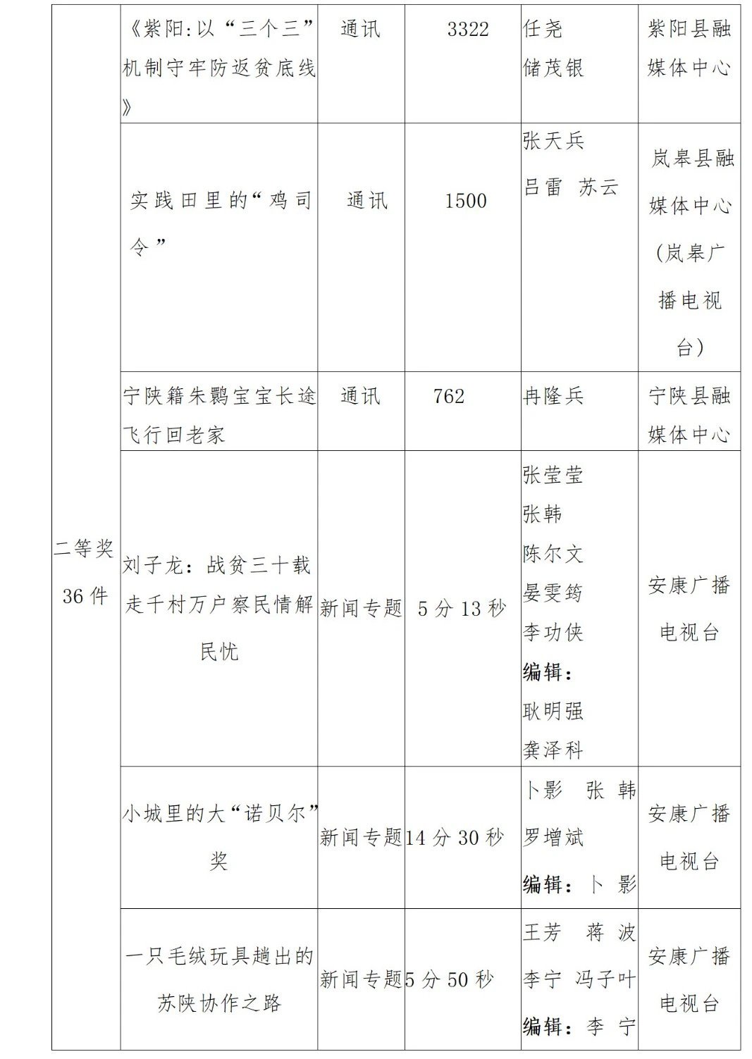 2022年度安康新聞獎評審工作在中共安康市委宣傳部的指導(dǎo)下,由市記協(xié)具體組織實(shí)施,經(jīng)過各申報(bào)單位推薦、初審,市記協(xié)復(fù)審并組織專家定評,評選出擬獲安康新聞獎作品96件,其中一等獎23件、二等獎36件、三等獎37件。擬授予姚登等14名同志“安康市優(yōu)秀新聞工作者”榮譽(yù)稱號。5ba安康新聞網(wǎng)
