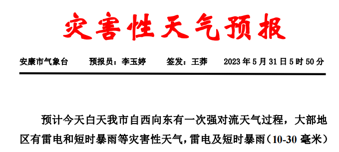 5月31日5時50分,安康市氣象臺發(fā)布《災害性天氣預報》G9f安康新聞網(wǎng)
