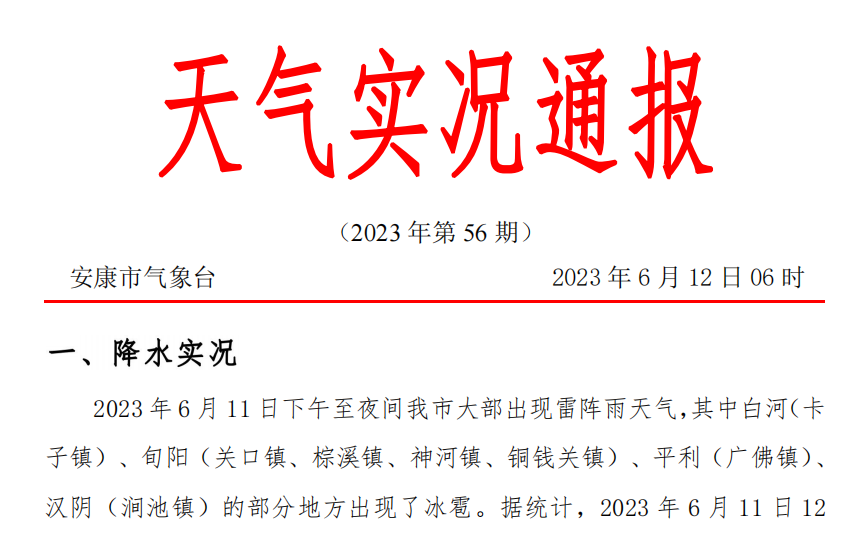 2023年6月11日下午至夜間我市大部出現(xiàn)雷陣雨天氣,其中,白河(卡子鎮(zhèn))、旬陽(關(guān)口鎮(zhèn)、棕溪鎮(zhèn)、神河鎮(zhèn)、銅錢關(guān)鎮(zhèn))、平利(廣佛鎮(zhèn))、漢陰(澗池鎮(zhèn))的部分地方出現(xiàn)了冰雹。據(jù)統(tǒng)計,2023年6月11日12時至6月12日06時安康市平均雨量為4.6毫米,其中單站雨量最大為平利八仙氣象監(jiān)測站52.8毫米,縣市平均雨量最大為平利縣12.4毫米,最大小時雨強出現(xiàn)在平利廣佛鎮(zhèn)秋河村氣象監(jiān)測站43.4毫米(6月11日17時至18時),共有154個氣象監(jiān)測站出現(xiàn)了降雨(大于0.1毫米),10毫米以上有50站,25毫米以上有14站,50毫米以上有1站。安康氣象監(jiān)測站4.3毫米。