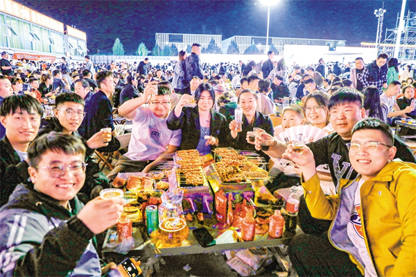 游客在山東省淄博市一家燒烤城吃燒烤(2023年4月29日攝)。新華社記者 朱偉