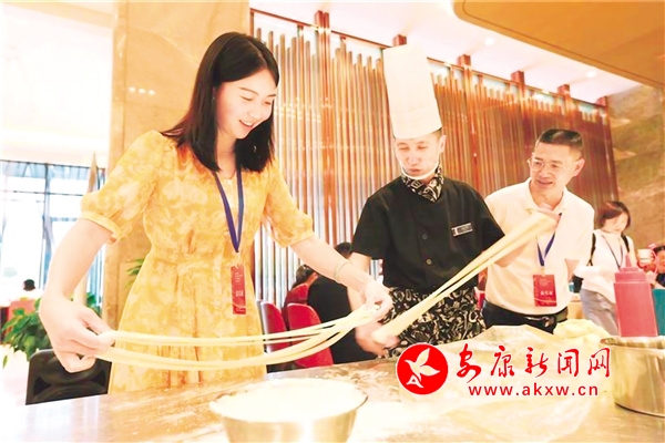 當天,拉面師傅向采訪團的代表們現(xiàn)場展示了牛肉拉面技藝——只見面團在師傅手中上下翻騰,一套動作行云流水,面劑子在拉面師傅手中神奇變化,從細到粗,從窄到寬,二細、韭葉、大寬……不同面型博得眾人一片喝彩。來自全國各地的媒體記者采訪、拍攝牛肉拉面制作過程,解鎖拉面技能。