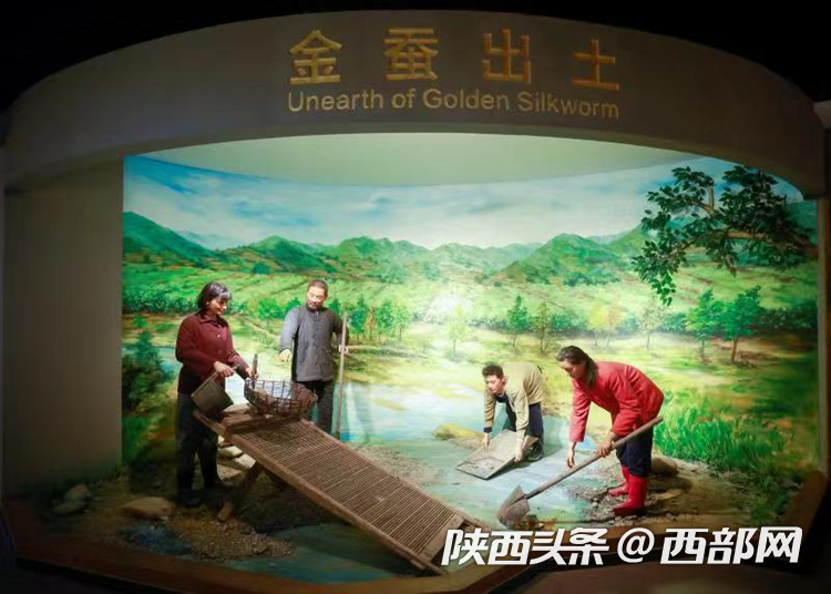 “和很多珍貴文物一樣,這條‘鎏金銅蠶’也是發(fā)現(xiàn)于不經(jīng)意間。”金蠶之鄉(xiāng)展覽館講解員向媒體采訪團介紹了那段歷史——1984年,石泉縣池河流域譚家灣農(nóng)民譚福全,在河水中淘金時,發(fā)現(xiàn)一條金光燦燦的金蠶。這只蠶通長5.6厘米,胸圍1.9厘米,胸高1.8厘米,首尾9個腹節(jié),體態(tài)逼真。此種鎏金蠶是迄今國內(nèi)首次發(fā)現(xiàn)的,經(jīng)專家鑒定為國家一級文物,它是西漢時期皇帝褒獎蠶桑生產(chǎn)的“御賜獎品”,非常珍貴。