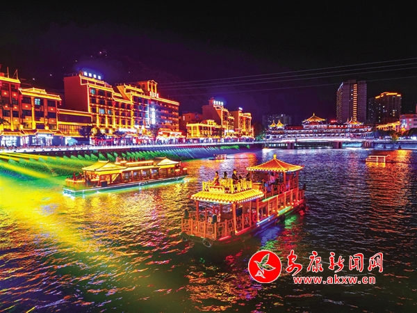 賽場內(nèi)氣氛熱烈,激情昂揚(yáng);賽場外活動(dòng)多樣,異常精彩。賽事期間,嵐皋化身“不夜城”,琉璃燈火,璀璨夜色。每天傍晚,嵐皋“硒旺”號(hào)畫舫乘著晚風(fēng)從碼頭緩緩出發(fā),在燈光輝映下流光溢彩,船上輕歌曼舞,為槳聲燈影里的嵐河平添了一道水上流動(dòng)風(fēng)景。嵐河兩岸紛紛開展各具特色的文旅活動(dòng),“嵐河夜畫”燈光秀把縣城裝扮得斑斕夢幻,花燈祈福、龍舟競渡等水上項(xiàng)目供游客參與體驗(yàn),cosplay、漢服、西游等主題巡游,處處飄蕩著歡聲笑語,各地游客在欣賞賽事的同時(shí),享受到更多豐富多彩的娛樂生活。拍照、直播、發(fā)朋友圈,據(jù)不完全統(tǒng)計(jì),賽事及相關(guān)活動(dòng)吸引860余萬網(wǎng)民圍觀。